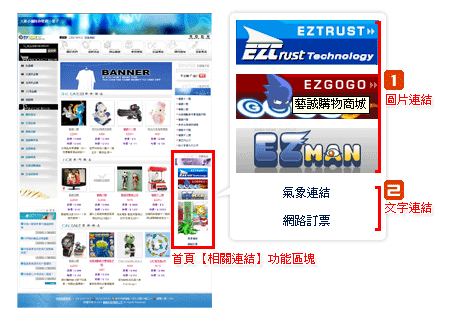 設定的相關連結,會顯示在商城首頁左右側的功能區塊,以banner圖片或文字連結呈現。