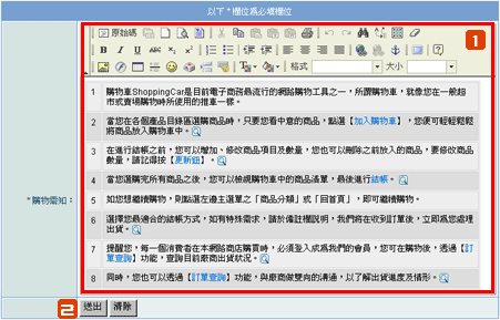 顯示於前台「購物需知」上半部。(下半部為付款方式)