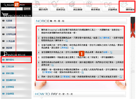 購物需知將會顯示於前台的「購物需知」中。提醒消費者購物時要注意的事項。