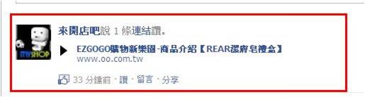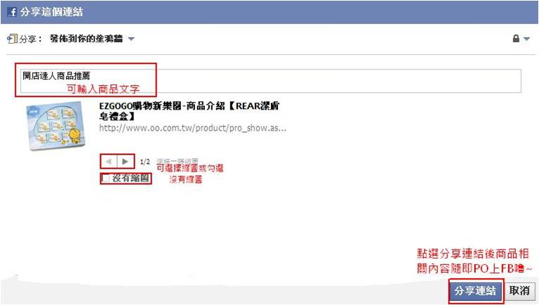 STEP3:登入後可將商品加入一些推薦文字,或是選擇圖片的顯示,並按下分享連結按鍵, 將資料上傳到FB,如下圖所示